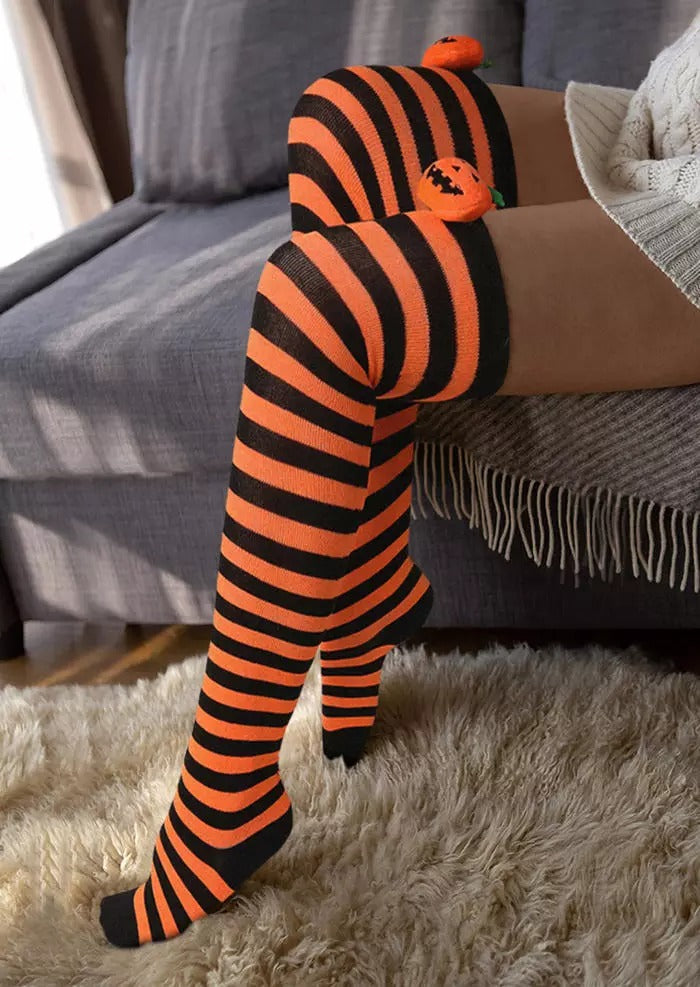 Halloween Pumpkin Face Striped Over Knee Long Socks