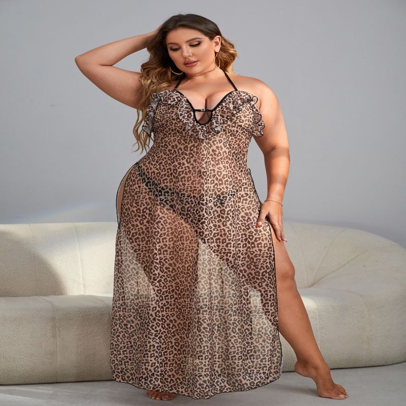 Plus Size Sexy Pajamas Leopard Print Nightgown Suspender See-through Long Skirt
